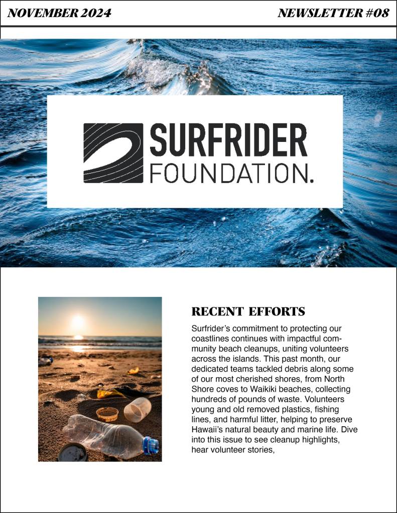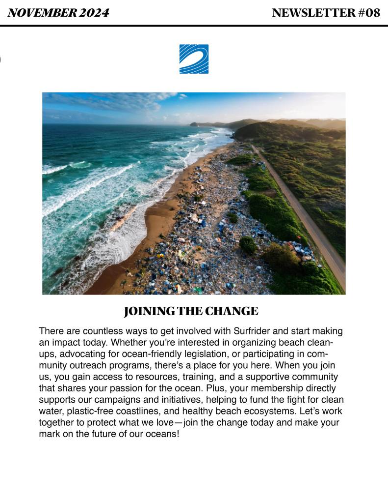 Designed a visually engaging Surfrider Foundation Newsletter that aligns with the organization’s mission to protect oceans and coastlines. The layout features clean typography, ocean-inspired graphics, and a well-structured format for readability. The newsletter effectively communicates updates, events, and advocacy initiatives, fostering community engagement and environmental awareness.
